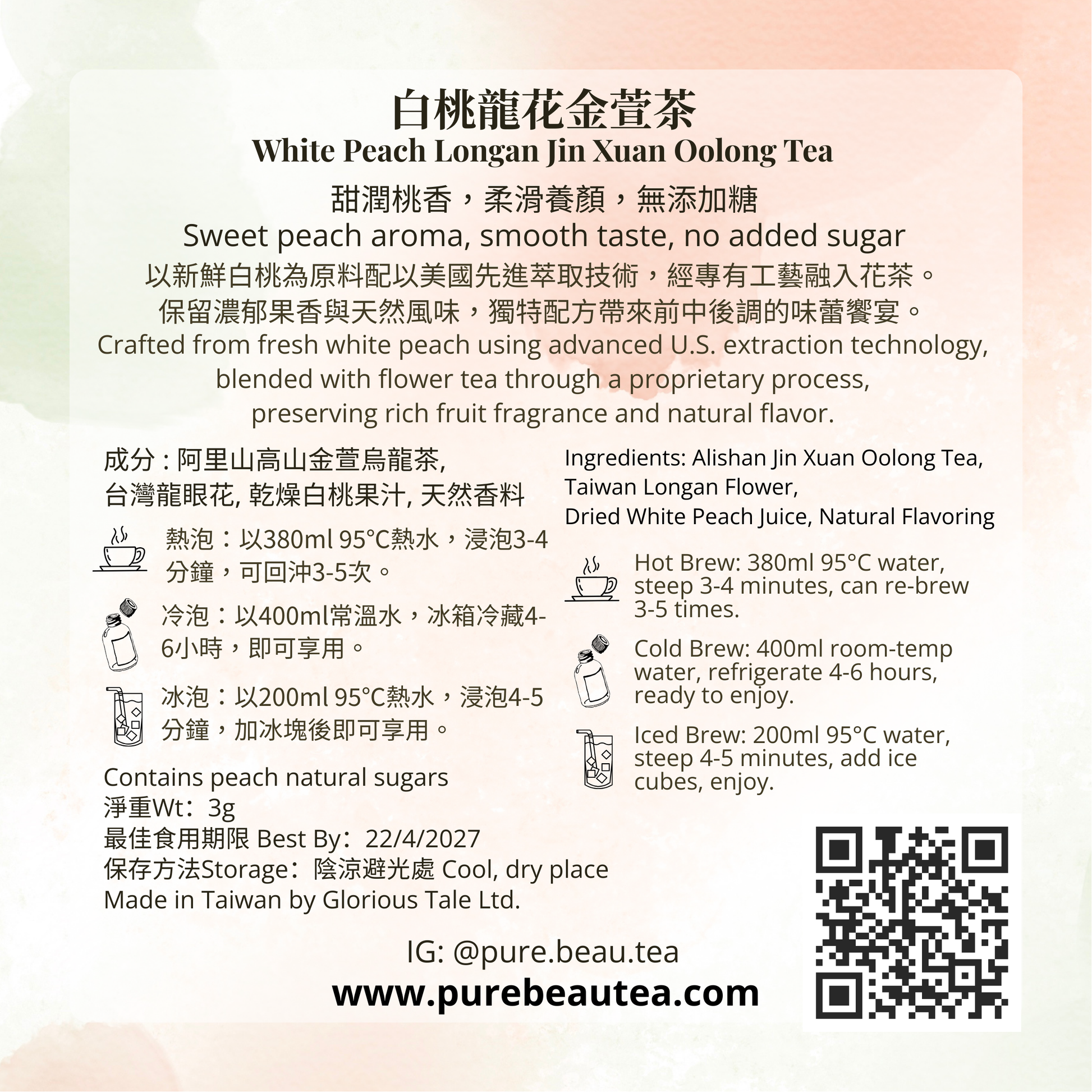 成分:阿里山高山金萱烏龍茶、台灣乾燥龍眼花、乾燥純白桃果汁、天然香料